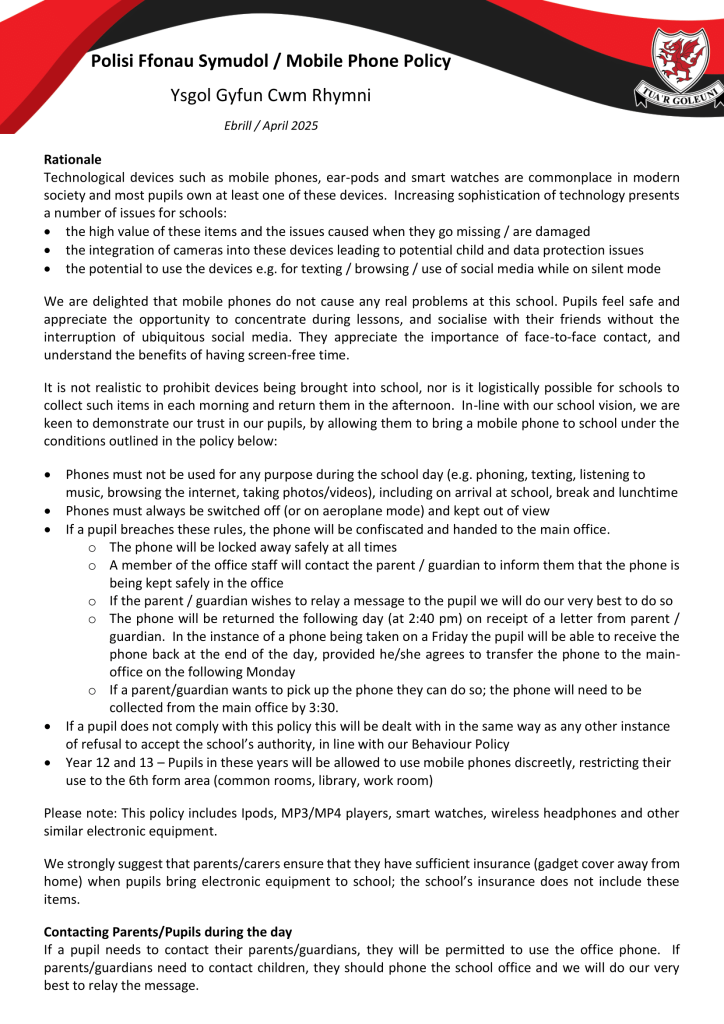 We are a unique school, as we are the only Welsh medium secondary school in Caerphilly County Borough. All pupils will be encouraged strongly to communicate with each other in Welsh, and to enjoy extra-curricular events that celebrate the use of the language. Parental involvement and encouragement for their children to speak Welsh as often as possible is essential.